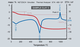 The TG-DTA analysis for Clay 3 is typical of well-ordered kaolin with total weight loss of about 12.8%. There are three distinct peaks as below:-| Peak/°C | Reaction |