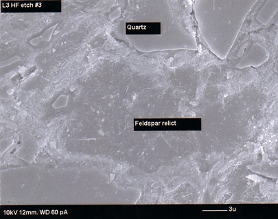 The other theory to explain mechanical strength is the matrix reinforcement hypothesis [9]. There is a fair amount of residual quartz particles as only a small portion dissolves in the melt. These residual quartz particles can be observed in Figure 3 and more clearly in Figure 5. These unreacted quartz crystals have a higher coefficient of thermal expansion than the surrounding matrix (glassy phase). The strong compressive stresses on the glassy phase cause strength improvements of the porcelain body.
