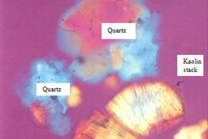 Clays were formed by alteration, through aging and weathering of rocks such as granite, feldspar, mica and quartz. At the origin, they are known as residual or primary clays. The clays were formed at the site of the parent rock and were not transported by any of the various agencies such as wind and water. Primary clays for eg. china clays are usually found in irregular pockets with unaltered rocks remaining. These deposits are coarse grained and non-plastic as the clay was not transported by water [6,7]. Therefore, there was no selective sorting of various particle sizes. Primary clays are normally uncontaminated by non-clay minerals as most of the primary clays originated from pure feldspar. Most kaolins are primary clays [6]. The fired colour of the china clay is white as it has a high degree of purity. Therefore, it is suitable for manufacturing china and porcelain. In addition, it is refractory due to its low impurity content. Figure 2 shows a micrograph of the kaolinitic stack using the polarizing microscope (transmitted light).