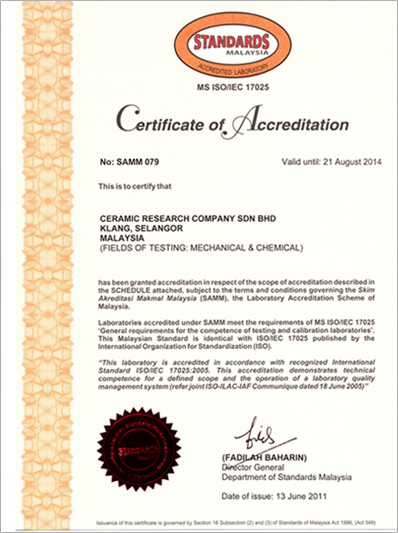 The Department of Standards Malaysia has sanctioned our thorough and precise quality control mechanisms as well as our testing equipment and laboratories which were accredited to ISO/IEC G25 in 1995 and upgraded to ISO/IEC 17025 in 2001.